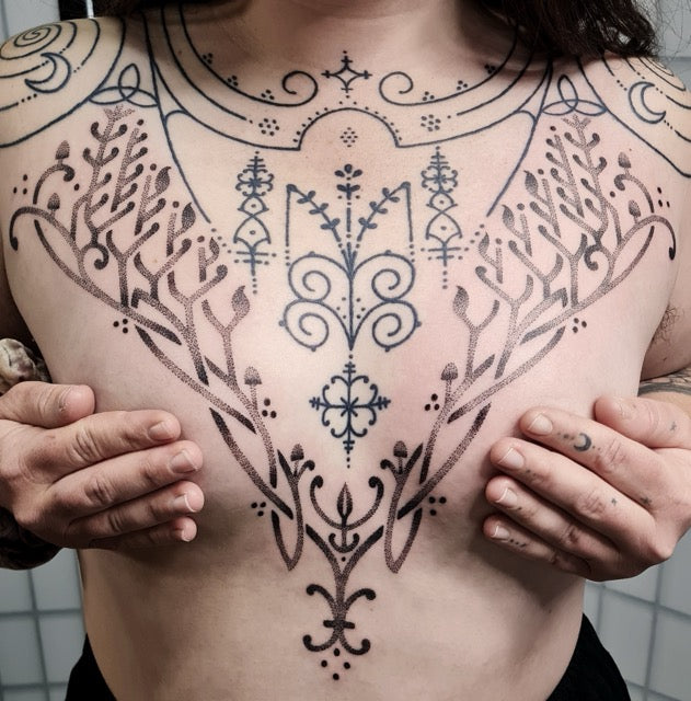 Originally British born, now resigns in Australia where she on a daily basis creates elaborate, stunning geometric and ornamental tattoos. In the last couple of years, she’s been working more and more with nordic pagan ornaments from the viking age, she produces stunning bold large scale pieces as well as small ornaments that tie in perfectly with people’s existing works. She has a great way of working with body dynamics, is not afraid to combine styles, like geometry into norse and norse into geometry. She is highly accomplished artist with a long history of doing elaborate pieces of work on 100s of clients and she is definitely worth keeping an eye on as she gos down the path of doing pagan designs.