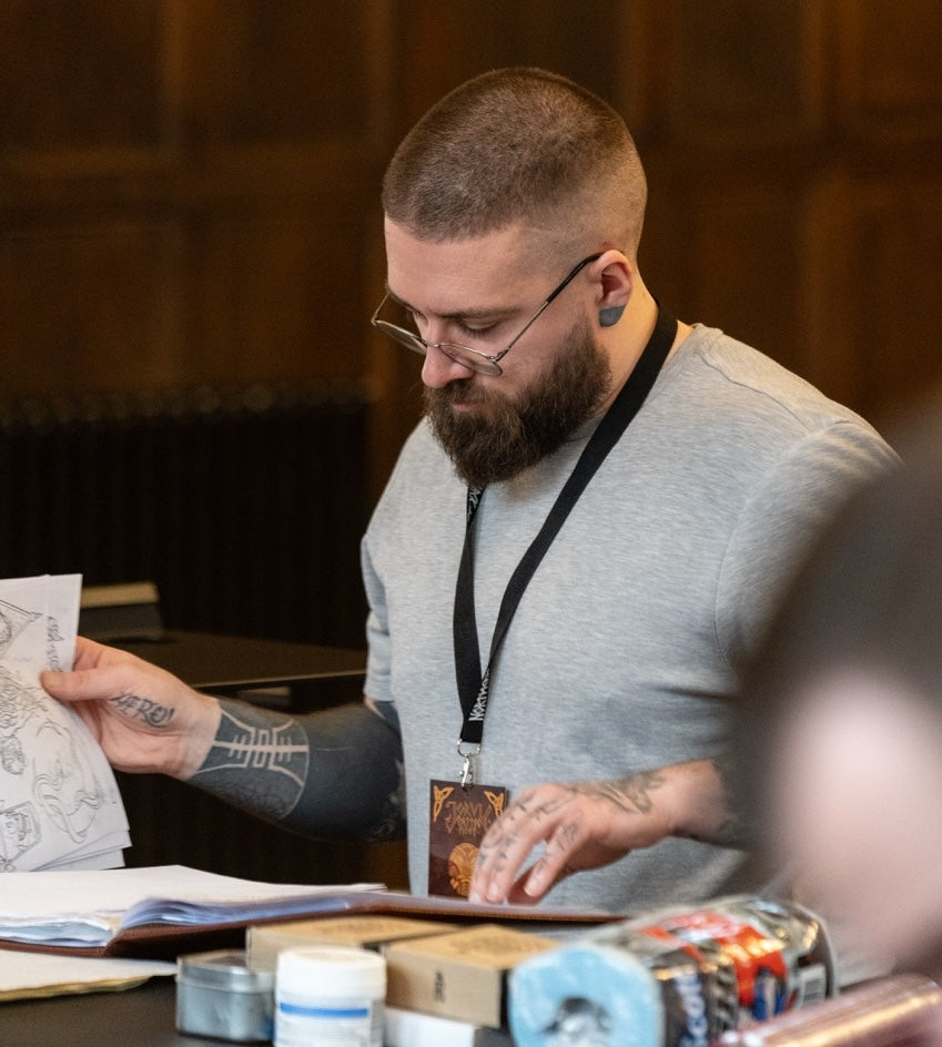 Rurik began tattooing in 2012 and has spent the past decade specialising in dotwork and geometric designs. He is now incorporating this into Nordic-style tattooing, focusing on God masks, runes, and wyrms. Passionate about this evolution in his work, he is eager to continue refining and expanding his craft.