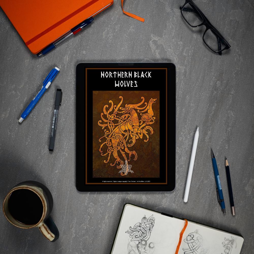 Accompanying the artwork is detailed historical information on the wolf's role and perception in Norse mythology, from Odin's companions to the beasts of Ragnarök. These insights offer an in-depth cultural perspective, enhancing the appreciation of the artistic designs.